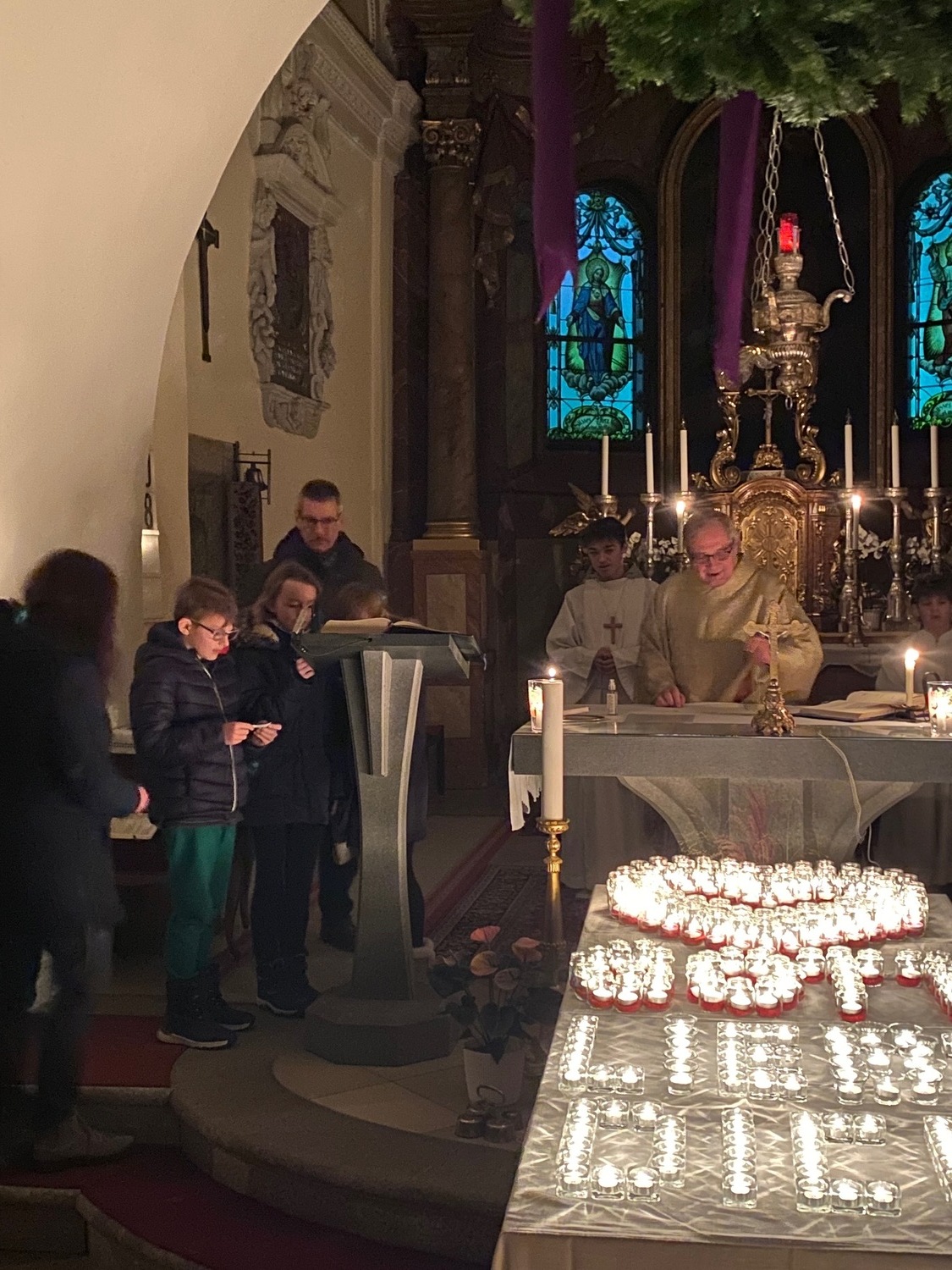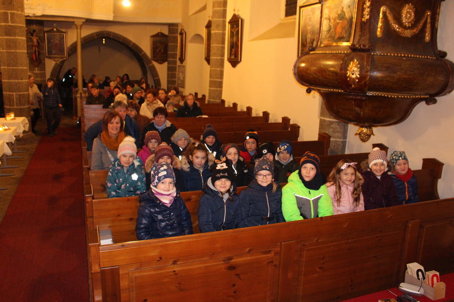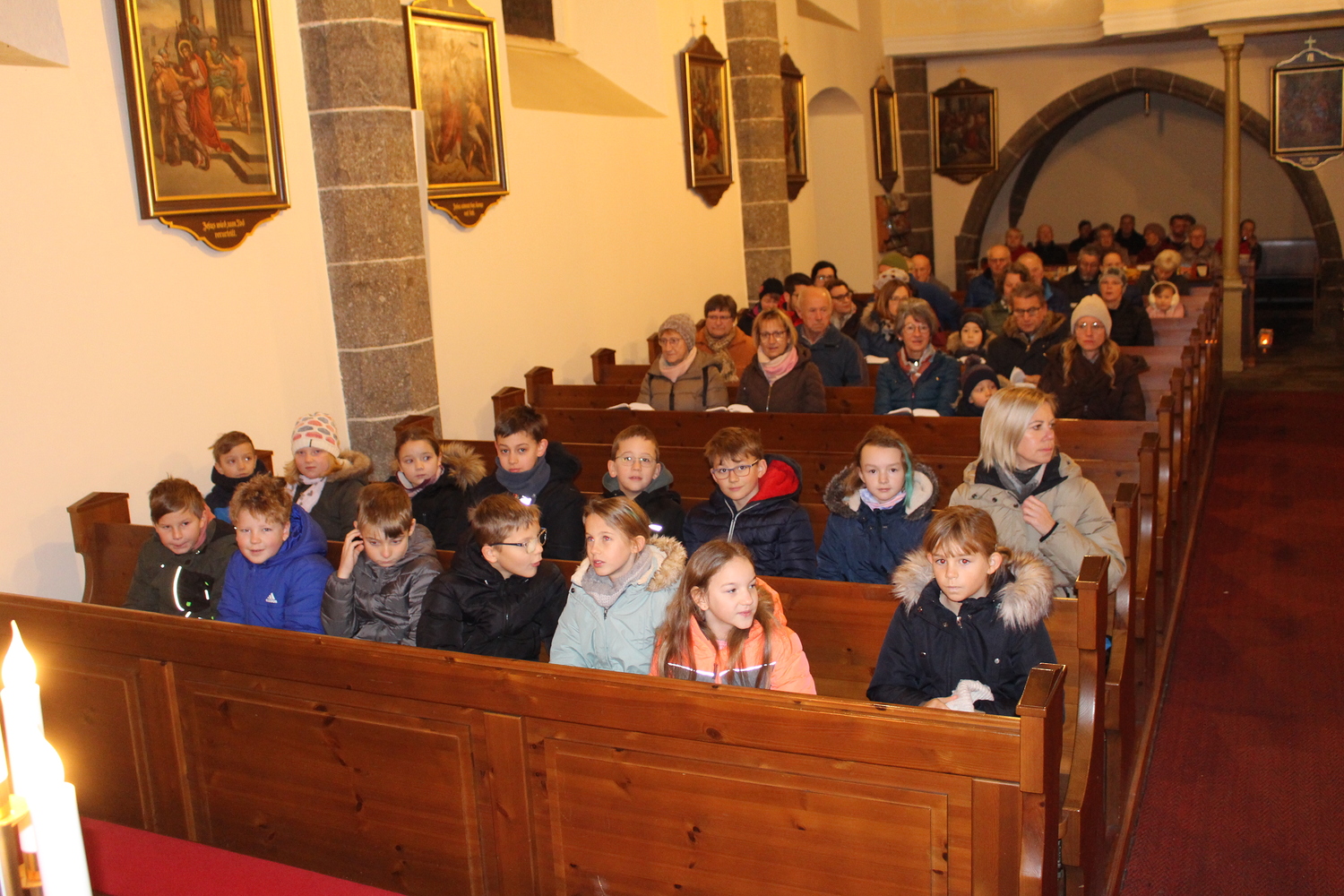 Viele Kinder der Volksschule besuchten mit ihren Lehrkräften gemeinsam die Roratemesse am 11. Dezember, um schon an diesem Tag unseren Pfarrer Pater Richard zum 70. Geburtstag zu gratulieren.