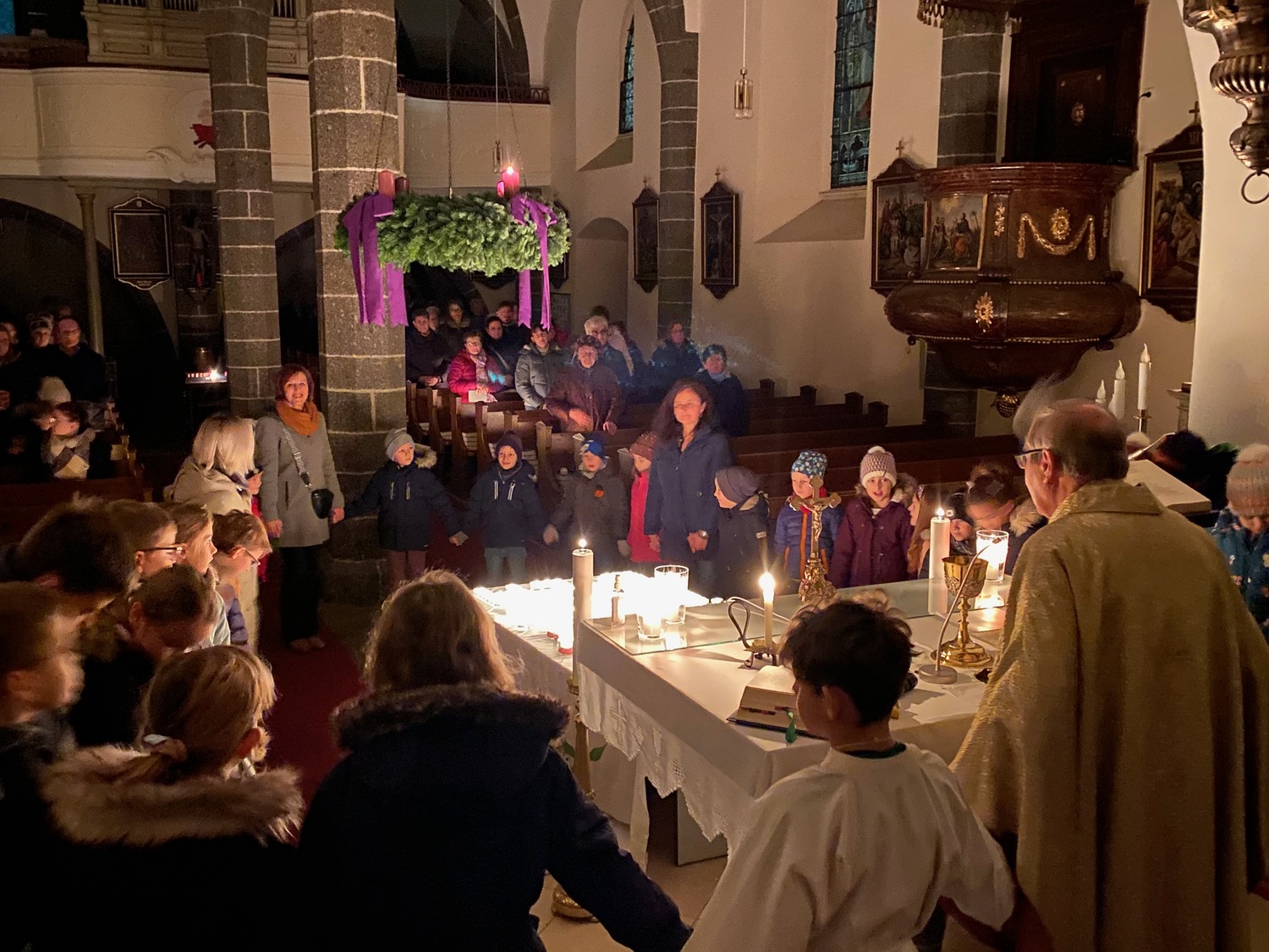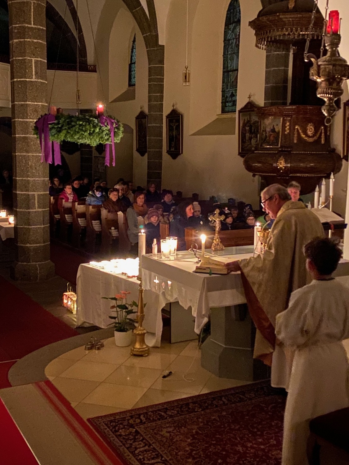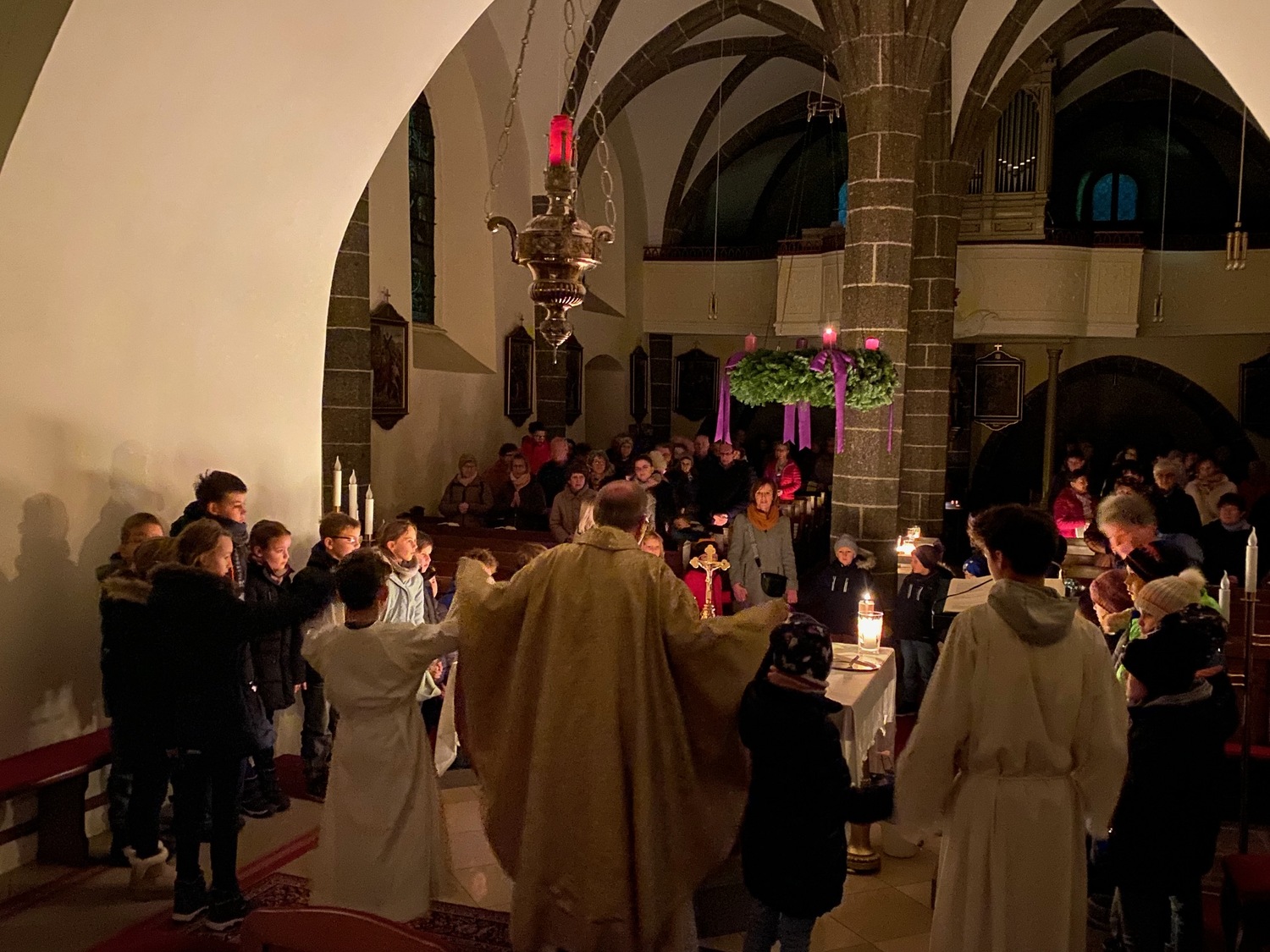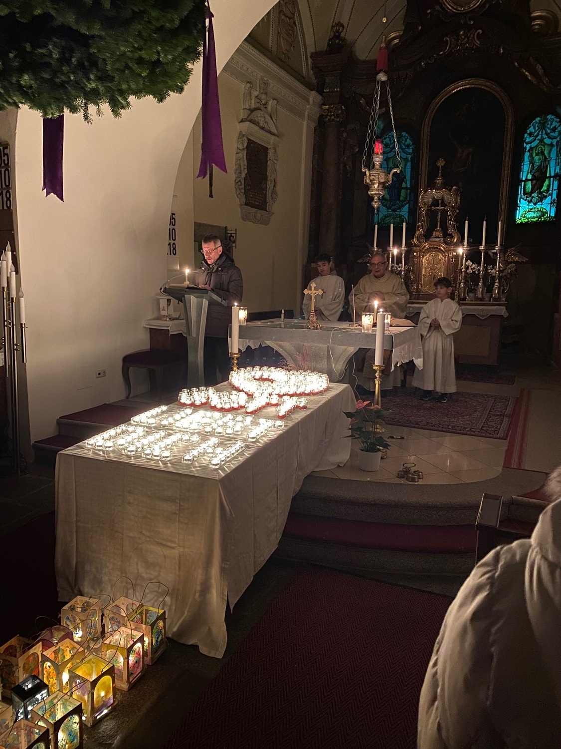 Viele Kinder der Volksschule besuchten mit ihren Lehrkräften gemeinsam die Roratemesse am 11. Dezember, um schon an diesem Tag unseren Pfarrer Pater Richard zum 70. Geburtstag zu gratulieren.